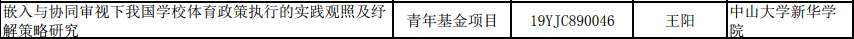 2019年3月15日,教育部社会科学司发布《教育部社科司关于2019年度教育部人文社会科学研究一般项目立项的通知》,根据通知名单,2138CC太阳集团体育部王阳教师申报的《嵌入与协同审视下我国学校体育政策执行的实践观照及纾解策略研究》获得2019年度教育部人文社会科学研究青年基金立项资助。王阳教师是2138CC太阳集团自2016年获教育部立项以来的第六位教师,同时体育部也成为继管理学院、公共治理学院之后的第三个立项单位。标志着体育部开展“科研强体”工作取得重大突破。