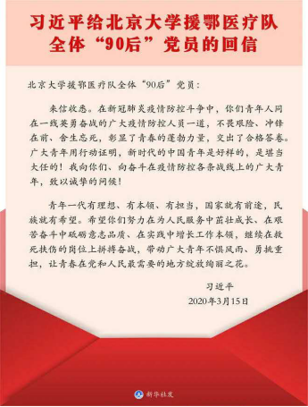 习近平给北京大学援鄂医疗队全体“90后”党员的回信
